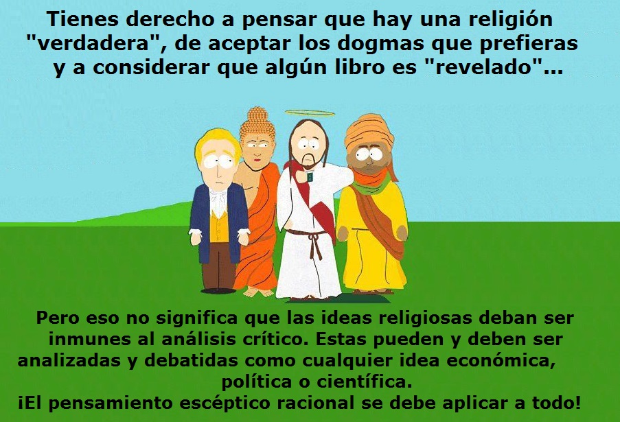 Tienes derecho a pensar que hay una religión "verdadera", de aceptar los dogmas que prefieras y a considerar que algún libro es "revelado" pero eso no significa que las ideas religiosas deban ser inmunes al análisis crÃtico. Estas pueden y deben ser analizadas y debatidas como cualquier idea económica, polÃtica o cientÃfica. El pensamiento escéptico racional se debe aplicar a todo. FYRV.