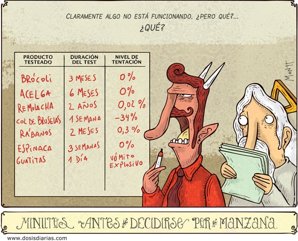 Una viñeta del blog Dosis diarias sobre las pruebas para elegir el fruto del árbol prohibido.
