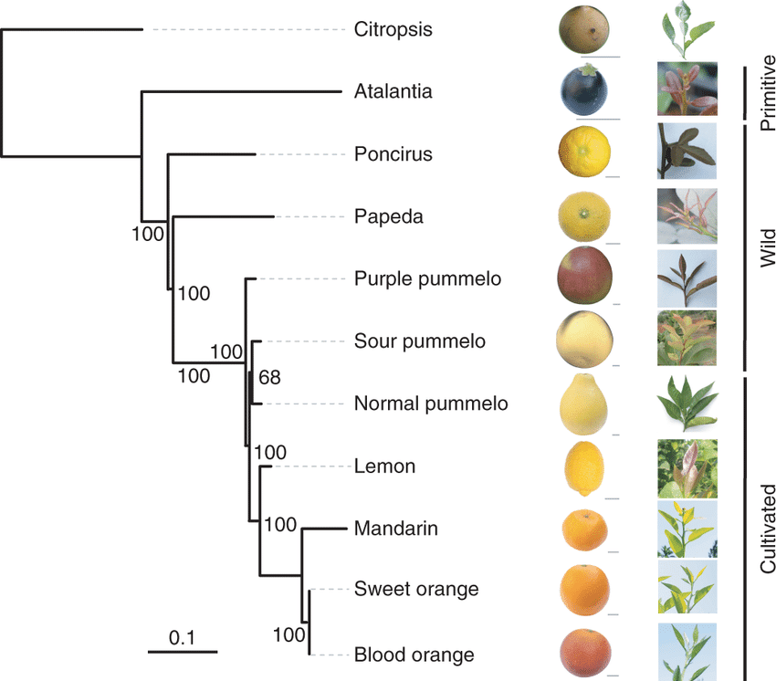 | Árbol filogenético utilizando polimorfismos de un solo nucleótido (SNP) de 11 accesiones en las regiones de genes de copia única conservados entre Citrinae. Trabajo de Ding Huang y colaboradores. La barra de escala indica el número promedio de sustituciones de nucleótidos por sitio. Citropsis gilletiana (Citropsis) se utiliza como grupo externo. A. buxifolia (naranja de caja china, Atalantia) es una especie de cítricos primitivos. Poncirus, papeda, pummelo morado y pummelo agrio son especies cítricas silvestres, limón, pomelo normal, mandarina y naranja dulce son variedades de cítricos cultivadas. Barras de escala, 1 cm. Imagen de Nature Plants |